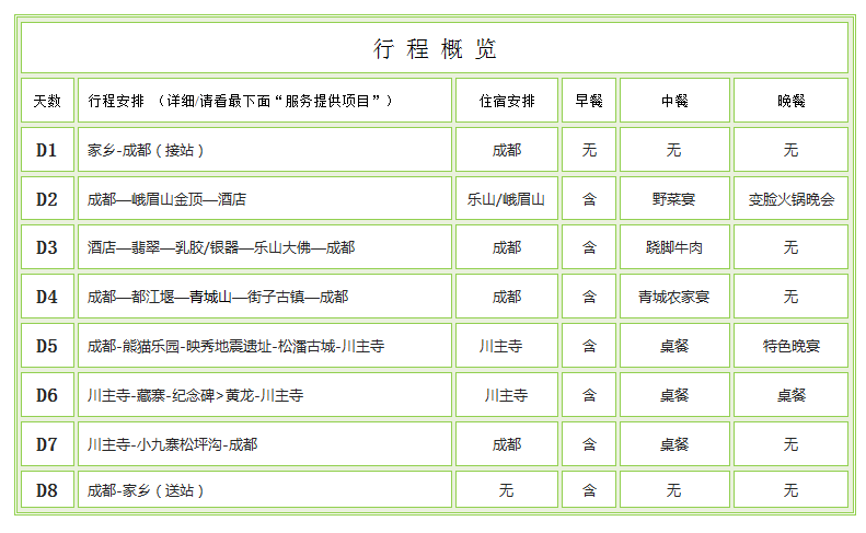 特别备注:游览后抵达成都茶店子统一散团,由导游安排车回送酒店。当天返回成都时间比较晚,由于高原路段有可能堵车,如果您当天有返程计划,请您尽量定第二天以后的火车或飞机以免因为堵车给您带来没有必要的损失。