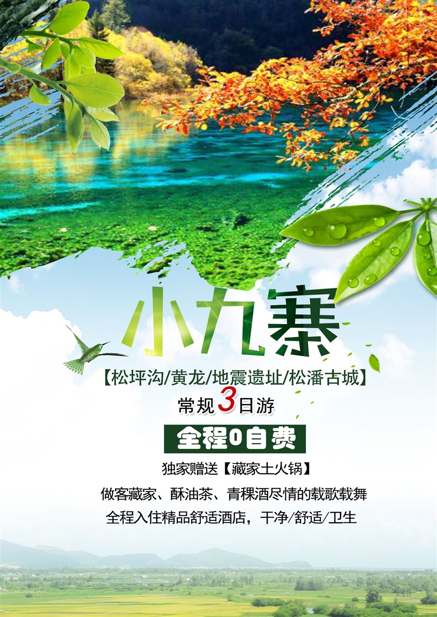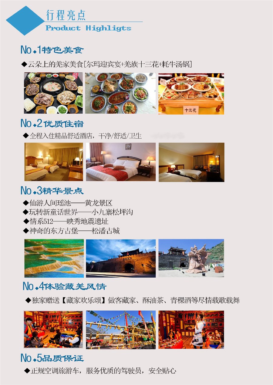 【行】早餐后从川主寺镇出发,途中参观具有藏族文化特色村寨(景区配有解说员,为游客解说,观赏少数民族饰品、观赏藏族表演、飘扬的经幡、屹立的白塔 、藏族老工匠绝世的手工艺。后参观土特产综合店,给自己的亲朋好友带一份当地的特产。午餐后返回成都结束此次愉快的旅行!
